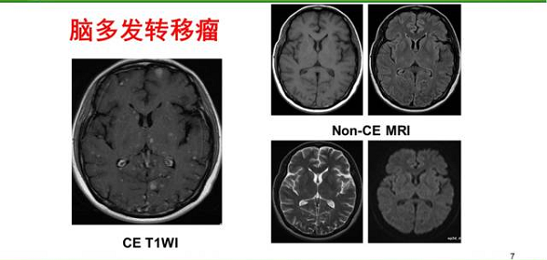 左側是增強掃描的效果,可以看到患者腦內有許多結節(jié),甚至同一個層面里面都能找到幾十顆強化結節(jié),可以診斷患者是一個腦的廣泛轉移。因為患者病灶很小,同時沒有引起周圍明確腦水腫,在平掃磁共振圖像上連異常都不能發(fā)現(xiàn),由此可見增強掃描非常重要。