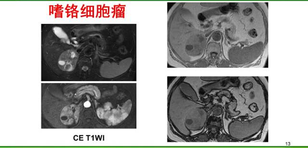 該病例MRI平掃已經明確檢出了腫塊,但定性診斷仍很困難。增強掃描以后,可見該腫塊明顯高強化,第一考慮是嗜鉻細胞瘤。該患者并無高血壓癥狀。臨床上約有15%到20%的嗜鉻細胞瘤患者無明確的高血壓癥狀,這些患者手術風險會更大。增強掃描提示了嗜鉻細胞瘤的診斷,術前做了精心準備,患者安全地完成了腫瘤切除,病理證實為嗜鉻細胞瘤。
